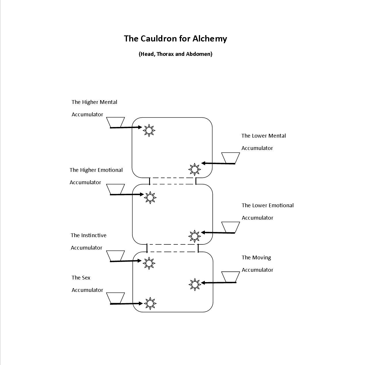 of the body. When the retort (our body) is empty, strange substances fill it quite unexpectedly and with a dim fire burning below the retort, strange combinations of psyche hydrogens are produced and experienced. Some of these compounds of psyche hydrogens could last for an hour, others a day, some a week and some a month. But each is the experience, the content and state of the inner being-octave and is a passenger for some time.